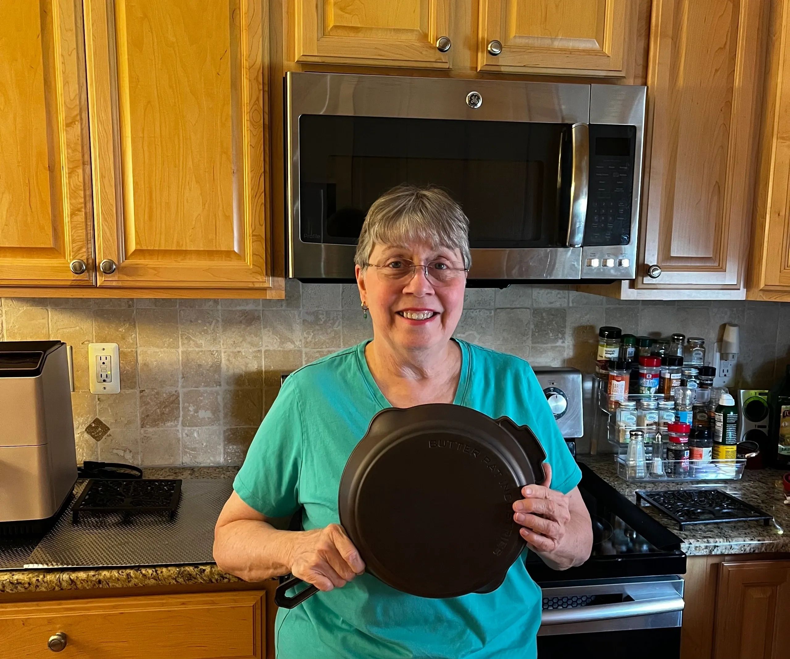 This month we recognize Kathy Wolf who lives in Elkins Park, PA. She sent a message and was concerned about her Butter Pat skillet having rug burns!